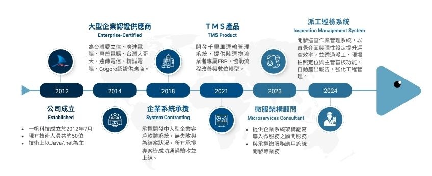 一帆科技成立於2012年7月,主要業務為以專業技術服務企業客戶,承攬企業軟體專案,維護企業應用系統,並提供運輸管理系統產品與物流顧問服務,現一帆科技現有技術人員50位,我們重視人材,投資人材,並與人材共同成長。